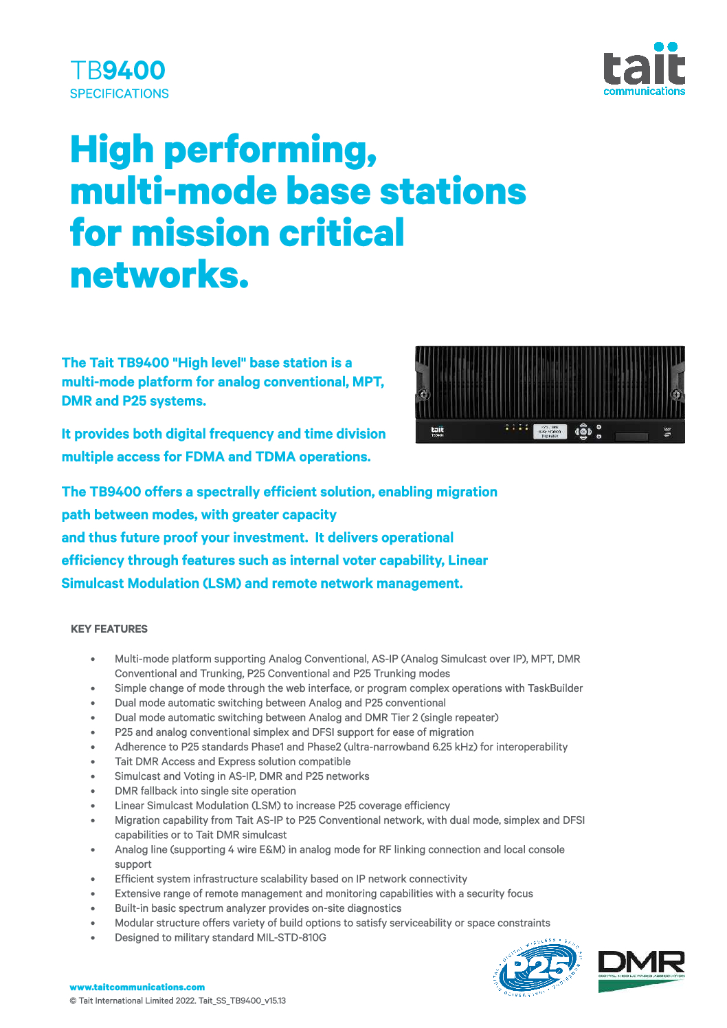- Migration capability from Tait AS-IP to P25 Conventional network, with dual mode, simplex, and DFSI capabilities or to Tait DMR simulcast